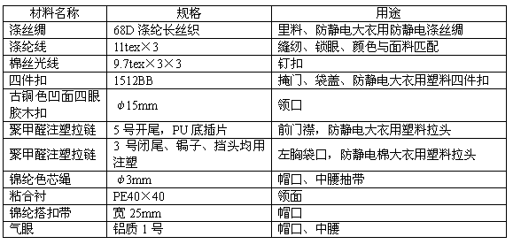 表3 防寒大衣輔料