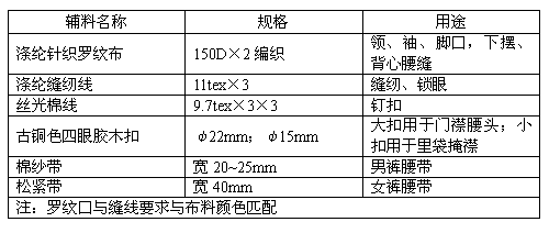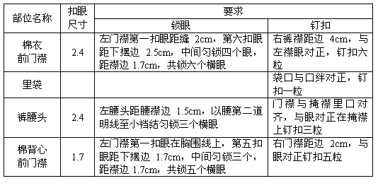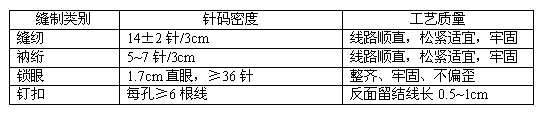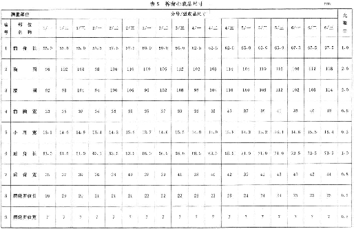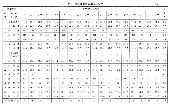 | 1 范圍 本標(biāo)準(zhǔn)規(guī)定了防寒棉服的品種區(qū)分、要求、檢驗方法和包裝等內(nèi)容。 本標(biāo)準(zhǔn)適用于防寒棉服的生產(chǎn)和檢驗。 2 引用標(biāo)準(zhǔn) 下列標(biāo)準(zhǔn)包含的條文,通過在本標(biāo)準(zhǔn)中引用而構(gòu)成為本標(biāo)準(zhǔn)的條文。本標(biāo)準(zhǔn)出版時,所示版本均為有效。所有標(biāo)準(zhǔn)都會被修訂,使用本標(biāo)準(zhǔn)的各方應(yīng)探討使用下列標(biāo)準(zhǔn)最新版本的可能性。 GB 250—84 評定變色用灰色樣卡 GB/T 2662—81 男女棉服裝 GB/T 12703—91 紡織品靜電測試方法 GB/T 13661—92 一般防護(hù)服 SY 5743.3—1995 石油企業(yè)職工勞動防護(hù)服裝 第3部分:防靜電服 SY 5743.4—1995 石油企業(yè)職工勞動防護(hù)服裝 第4部分:易去污防護(hù)服 3 品種 防寒棉服分為以下五個品種: ——450g/m2防寒棉衣褲(分男、女兩式); ——400g/m2防寒棉衣褲(分男、女兩式); ——300g/m2防寒棉衣褲(分男、女兩式); ——200g/m2防寒棉衣褲(分男、女兩式); ——防寒棉背心。 4 要求 4.1樣式 防寒棉服樣式見圖1。 4.2尺寸 防寒棉衣褲的成品尺寸按絮量厚薄的不同要求,分為厚型(450g/m2、400 g/m2)、薄型(300g/m2、200g/m2)兩組尺寸系列。加上男、女的不同要求,共有以下四組棉衣褲的成品尺寸系列: ——男式厚型棉衣褲成品尺寸,見表1; ——女式厚型棉衣褲成品尺寸,見表2; ——男式薄型棉衣褲成品尺寸,見表3; ——女式薄型棉衣褲成品尺寸,見表4; 棉背心的成品尺寸見表5。 棉衣褲的測量部位見圖2。棉背心的測量部位,見圖3。 ![]() 圖1 防寒棉服樣式 棉背心的成品尺寸見表5。 棉衣褲的測量部位見圖2。棉背心的測量部位,見圖3。 4.3材料 4.3.1面、里用草綠色68D滌絲綢,加防靜電整理。 4.3.2采用熱熔法滌綸絮片或性能不低于該絮片的其它保暖材料。 4.3.3輔料按表6規(guī)定。 4.4工藝 防寒棉服的工藝技術(shù)要求見附錄A(標(biāo)準(zhǔn)的附錄)。 ![]() 4.5性能指標(biāo) 表1 男式厚型棉衣褲成品尺寸 cm ![]() 表2 女式厚型棉衣褲成品尺寸 cm ![]() 表3 男式薄型棉衣褲成品尺寸 cm ![]() 表4 女式薄型棉衣褲成品尺寸 cm ![]() 表5 棉背心成品尺寸 cm ![]() 表6 防寒棉服輔料要求 ![]() 5 檢驗 附錄A(標(biāo)準(zhǔn)的附錄) ![]() A1.3衣片的外觀疵點(diǎn)按GB/T 2662—81第8章規(guī)定執(zhí)行。 ![]() A2.2縫紉工藝要求,見表A3。 ![]() 表A3(完) ![]() A2.3絮絎工藝要求: ![]() |