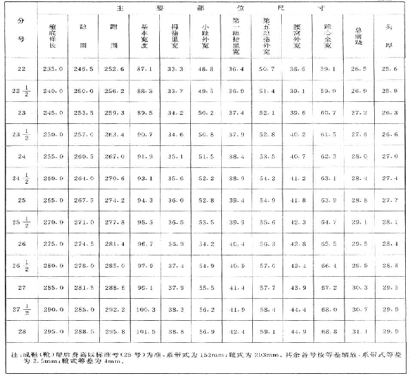 防水耐油安全工作鞋(靴)的尺寸以鞋楦尺寸為準,見表1和表2。測量方法按GB/T 3294規定執行。