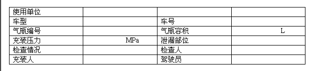 11.9 充裝后,應認真填寫記錄,內容應包括:使用單位、車型、車號、充裝壓力、充裝者和司機簽名。詳見附錄B(補充件)。