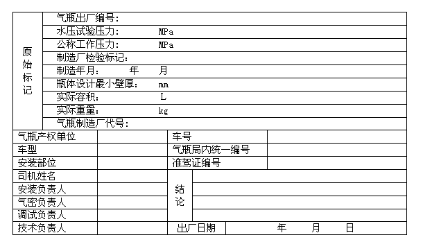 10.6 氣瓶安裝出廠時,應做好登記。內容包括:車型、車號、車況、車屬單位、氣瓶的出廠檢驗標記、氣瓶安裝、調試情況等。詳見附錄A(補充件)。