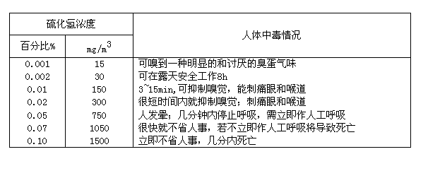 硫化氫的毒性較一氧化碳大五至六倍,幾乎與氰同樣劇毒。不同濃度的硫化氫對人體的危害見表1。