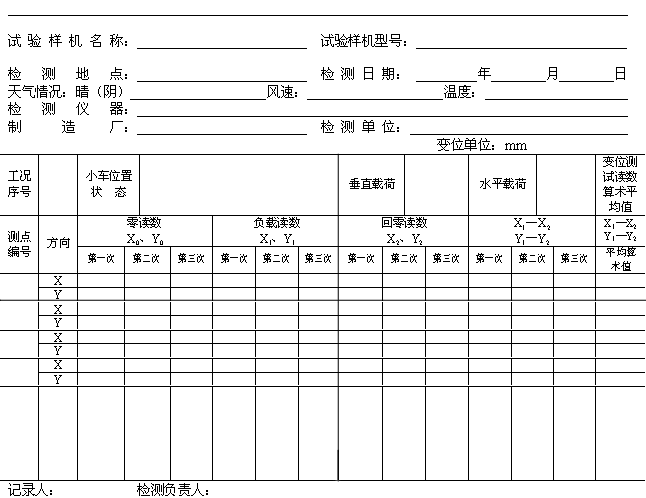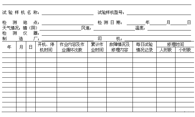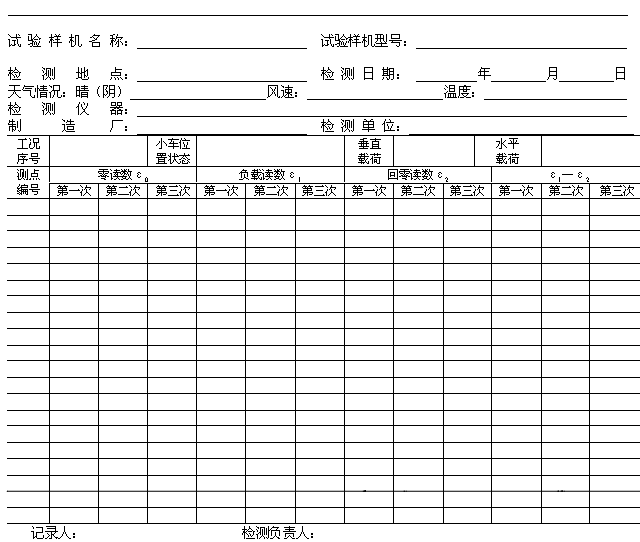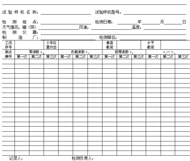 試驗報告要標明所試驗樣機的編號、型號、規格及執行的產品標準代號,記下試驗日期、地點及檢測人員的姓名,詳細記錄每種試驗工況下的載荷、位置、狀態、程序和結論,并將試驗結論和檢測結果列成表格注明。