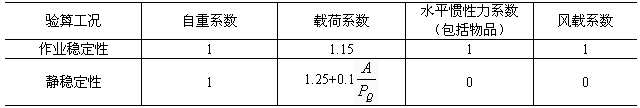 a. 起重機抗傾覆穩定性的校核,應按表4所列工況在最不利的載荷組合條件下進行,包括起重機自重在內的各項載荷對傾覆邊的力矩之和大于或等于零,則認為起重機是穩定的。計算時規定起穩定作用的力矩符號為“正”,使起重機傾覆的力矩符號為“負”。考慮各種載荷對穩定性的實際影響程度在進行起重機抗傾覆穩定性校核時,各載荷力矩應分別乘一個載荷系數,如表4所示;