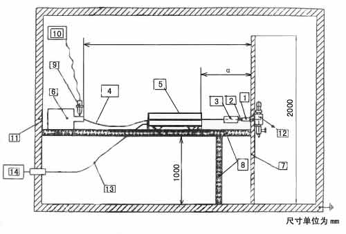 在圖E1中,調節同軸開關②,以便信號發生器①的信號通過試驗箱④和受試樣品⑤,使測量儀器⑦的輸出指示器給出一個讀數。固定衰減器③有10dB的衰減損耗。