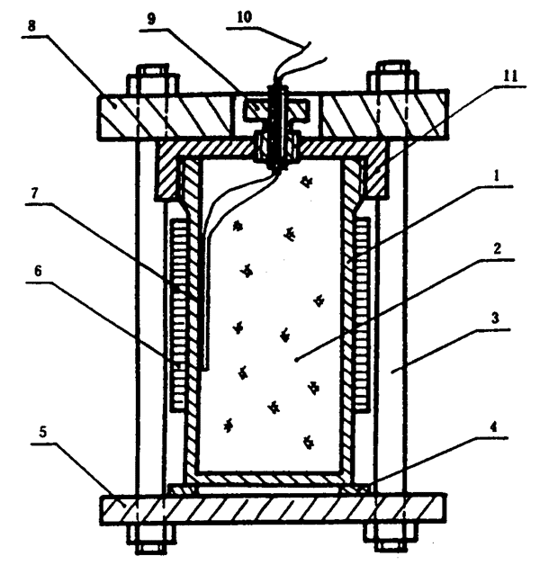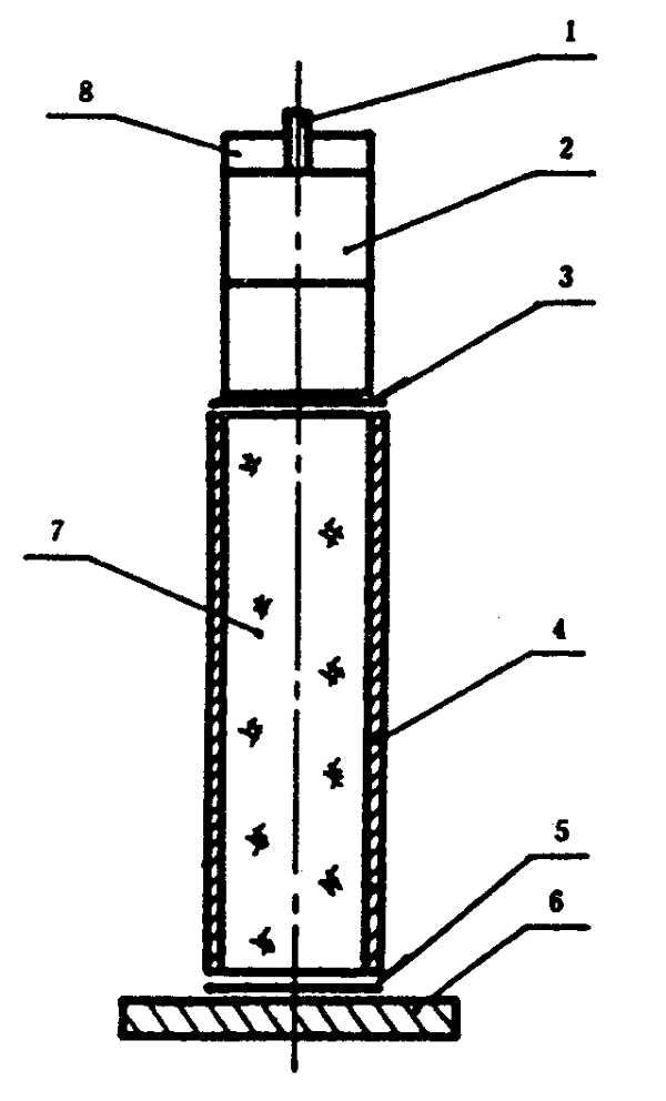 1— 雷管;2—主發藥柱;3—隔板;4—樣品管;5—硬紙板;6—鋼見證板;7—試樣;8—雷管座