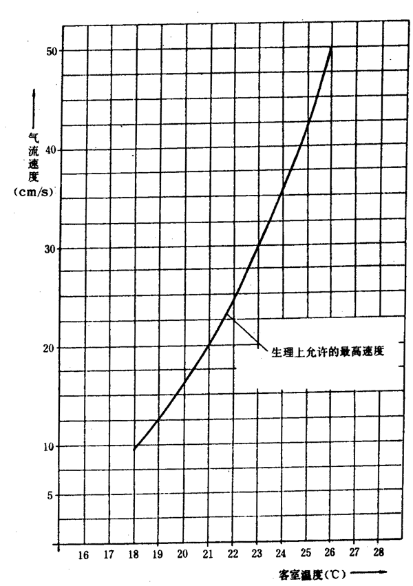 B1 客室內(nèi)通風(fēng),為使氣流速度不致影響乘客的舒適度,氣流速度應(yīng)符合客室溫度與氣流速度的關(guān)系曲線見圖B1。