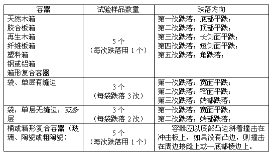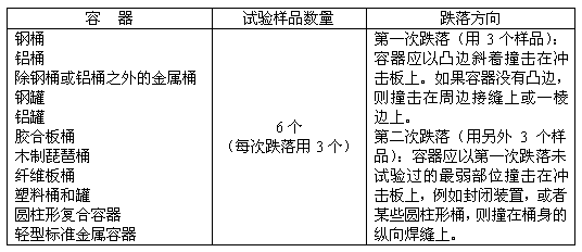4.2.2 對裝液體的容器進行跌落試驗時,如使用其他物質代替,該物質必須有與待運物質相似的相對密度和粘度。水也可以用于進行5.1.5條件下的液體跌落試驗。