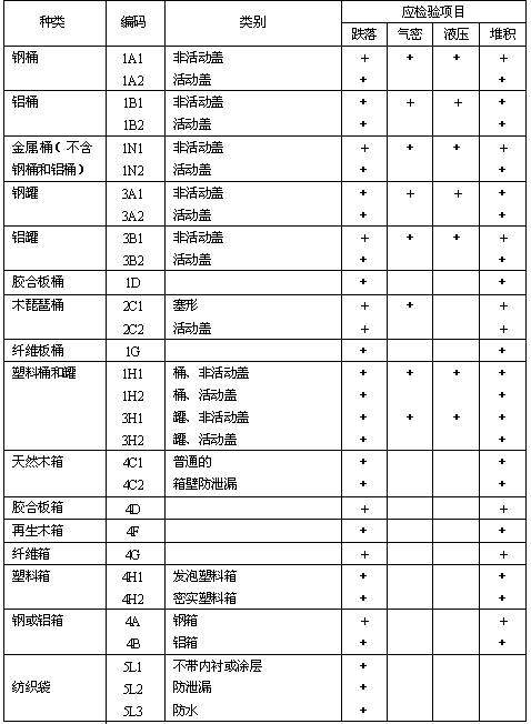 表A.1給出了各種常用公路運輸危險貨物包裝容器應檢驗項目的要求。