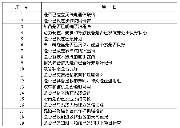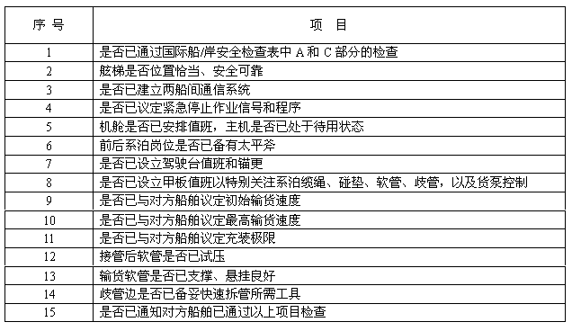 b) 進行安全檢查,檢查項目應不少于“靠泊前船/船裝卸安全檢查項目”,見附錄A(標準的附錄)的表A1。