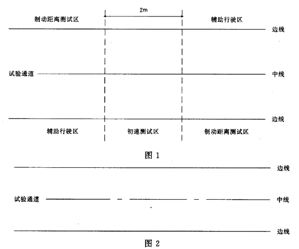 4.5 使用電子計時裝置時,在試驗道路上劃分三個區間(見圖1),輔助行駛區、制動距離測試區應有足夠的長度,初速測試區兩端設電子計時裝置。