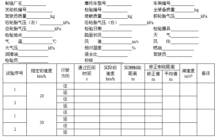 5.7 各指定初速度下的制動距離進行兩次試驗,將數據記入附錄A(補充件)表中,取修正制動距離的算術平均值中最小值作為受試摩托車的制動距離值,計算值修約后保留到小數點后二位。