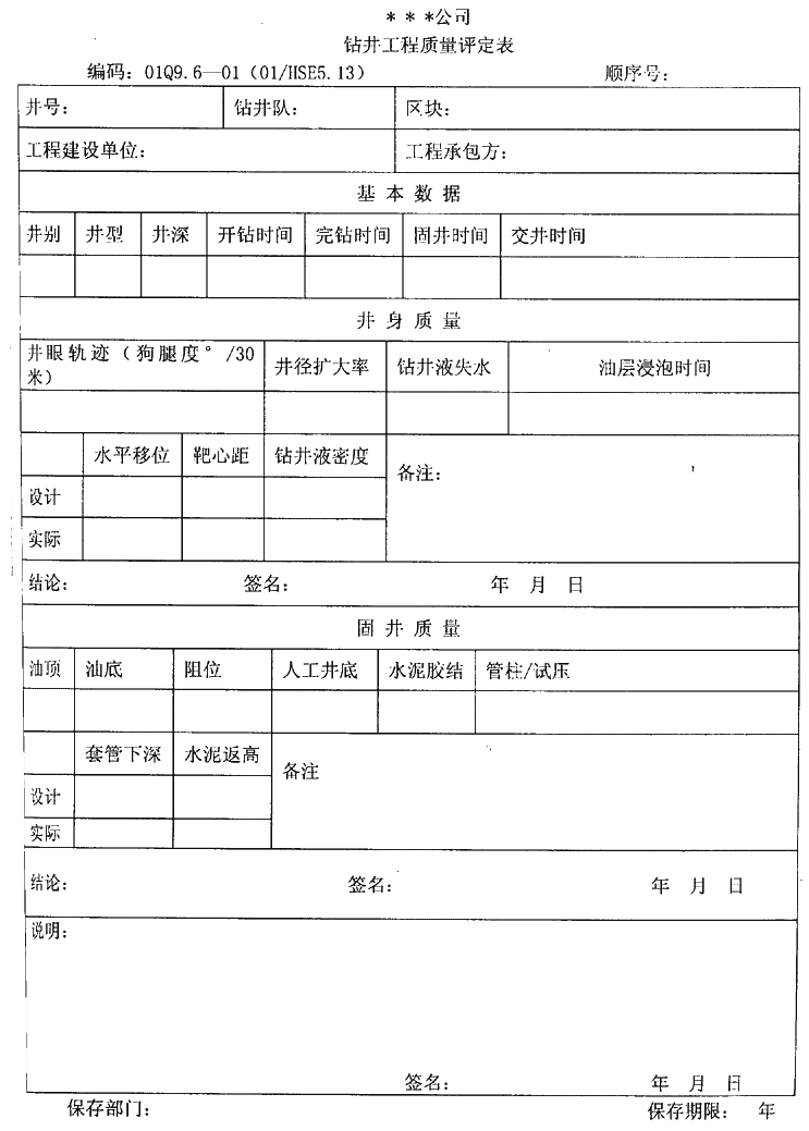 4.8 鉆井工程建設單位負責對所屬完成井鉆井工程質量進行評定,填寫“鉆井工程質量評定表”[01Q9.6-01(01HSE5.7-01)],并將評定結果每季度報生產協調部;生產協調部對完成井的質量評定情況進行監督檢查并對有爭議井進行裁定。