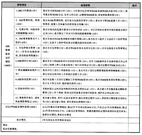 資格預審主要是對于承包商的施工資格和安全資格進行審核和確認,分別由機動部門(項目管理是部門)和安全環保部門來進行。機動部門收集有關承包商的資質證書、工商行政營業執照、安裝許可證、檢修安裝業績等資料后,對承包商的經營范圍、施工管理能力、工機具、隊伍素質進行審核,合格后頒發《工程項目施工資格確認證書》。承包商在取得機動部門核發施工資格確認證書后,向安全環保部門提交有關材料,安全環保部門確認其安全資格。在實際工作中,我們把承包商安全資格的確認同承包商安全信譽等級結合起來進行量化評價,把承包商的安全信譽等級分5級,其中得分為180~200分的為5S級,160~179分的為4S級,140~159分的為3S級,120~139分的為2S級,119分以下的為1S級。5S級為安全信譽等級最高,IS級為安全信譽等級最低。安全信譽等級達到3S級及其以上的為合格,可辦理《工程項目安全資格確認證書》。3S級以下的為不合格,不予辦理安全資格確認證書。確定安全信譽等級的依據是承包商HSE管理體系的建立和執行事故情況;過去2年內的HSE業績;在企業內的違章及事故情況。承包商出現違章的事故時,按性質的不同分別扣除不同的分值,若承包商在1年內未發生任何事故,在評價發全信譽等級時可加分。承包商安全信譽等級評價的具體內容和標準見表1。