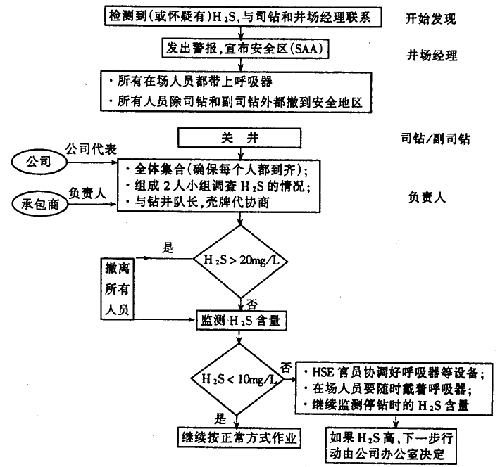 —確證不再涌出。如果沒(méi)有檢測(cè)到涌出,而硫化氫含量又大于10mg/L,關(guān)井并向公司鉆井監(jiān)督提出意見(jiàn)