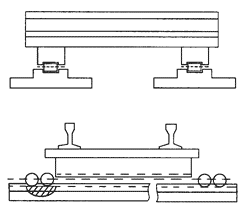 平交道裝置(見(jiàn)圖1),其功能是起方向轉(zhuǎn)換作用。該裝置分上下兩個(gè)結(jié)構(gòu)層組成,下層裝有四個(gè)輪子,這四個(gè)輪子沿橋的垂直方向轉(zhuǎn)動(dòng),與鋪在橋面上的兩條滑道配合,使該裝置在卷?yè)P(yáng)機(jī)的牽引下能沿橋的垂直方向即橫向移動(dòng);上層沿橋的軸線方向固定兩根鐵道鋼軌,鋼軌軌距與水平高度和橋面上縱向鋪設(shè)的鋼軌軌距與水平高相等。