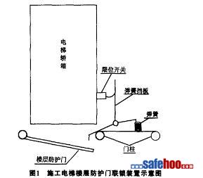 經過多次現場試驗和工藝改進證實,這種新的防護方法簡便易行,基本克服了過去傳統做法的弊端:首先,我們把防護門高度加高到1.7m,使待乘電梯人員無法探出頭,減少了意外事故的發生;其次,防護門中間部位70cm用金屬板材封閉,防止施工人員伸出手去開門開鎖;第三,碰鎖安裝在防護門外側,由電梯操作人員控制,樓層待乘人員無法打開;最后,如若出現個別樓層防護門失靈被打開,與樓層防護門聯動的擋板會將運行的轎箱自動攔截,只有把防護門恢復到關閉位置時,電梯方能繼續啟動運行。