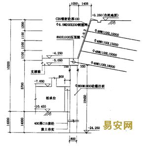 4.3.2壓頂梁斷面1000×800,內配16ф25+ф16、ф8@200。土釘墻的最下一排錨桿應錨入混凝土壓頂梁內。