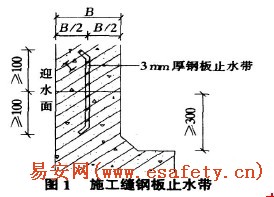 2)采用中置式鋼板止水帶時(shí),止水帶應(yīng)垂直放置于施工縫的正中間位置并固定牢固,其翼緣應(yīng)朝向迎水面,以更好的起到止水作用(見圖1)。
