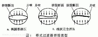 1 過濾器擠毀事故類型與成因1.1 過濾器擠毀事故類型在松散層中地熱鉆探成井,一般采用的是 159mm橋式過濾器。它是由普通鋼板沖壓后再卷焊而成的一種過濾器,其厚度在5 3~5 7mm之間。此類型的過濾器出現擠毀和變形事故常發生在下管過程、投礫過程或洗井抽水過程3個階段。按變形量劃分其過濾器斷面可能出現橢圓形和線狀(完全擠壓)2種類型,其中多數情況下出現后者類型的事故,如圖1所示。