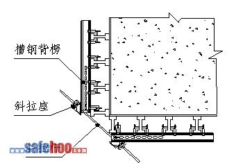 覆膜木膠合板模板之間通過(guò)硅膠來(lái)密封板縫,面板與木工字梁之間采用L30×30×2角鋼和φ4木螺絲背面聯(lián)接,間距為300 mm,面板的每個(gè)角各安裝一個(gè)角鐵,木工字梁與16#雙槽鋼采用專(zhuān)用卡具連接,柱箍槽鋼一端采用φ20銷(xiāo)子通過(guò)直角芯帶連接、另一端則采用T26螺栓斜拉緊固。陽(yáng)角處模板通過(guò)45度的斜拉桿連接,有效保證角部不開(kāi)模、不漏漿。
