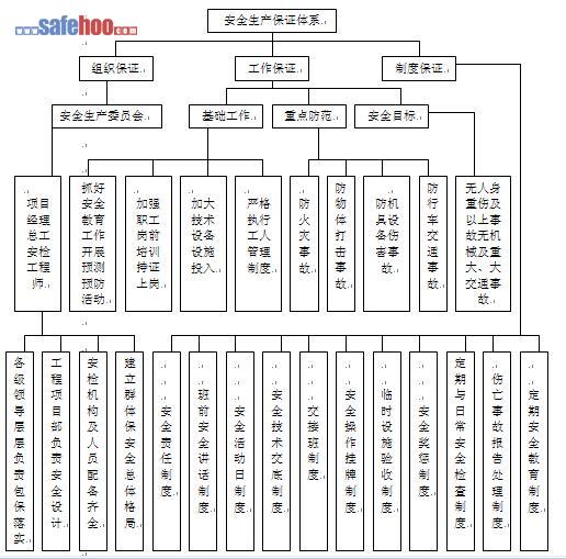 為實現安全目標,強化安全管理,本項目成立以經理、總工程師、安全檢查工程師為主要成員的安全生產委員會,下設安全檢查室。安檢室配備安全檢查工程師,施工隊專設專職安全員,工班配兼職安全員,形成自上而下的安全生產監督、保障體系,對施工生產全過程實施安全監控。經理部負責安全設計,隊、班組負責實施。建立各級領導層層負責,包保落實,群體保安全的總體格局,為實現安全生產提供強有力的組織保證。