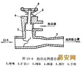 固定泡沫站一般由消防水泵、泡沫比例混合器、泡沫產生器(又稱泡沫室)、水池和泡沫液貯罐組成。泡沫比例混合器的作用是使泡沫液與水按一定比例進行混合其構造如圖13—9。