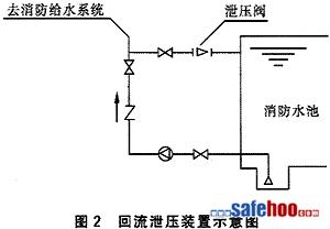 回流泄壓裝置的原理如圖2所示,在消防水泵的出水管上設一去消防水池的支管,支管上設置泄壓閥,當管網壓力超過設定工作壓力一定范圍(30%)時(泄壓閥開啟壓力設定點),泄壓閥自動打開回流泄壓,以防管網超壓。火災初期,由于實際消防用水量較小,而水泵仍然按照它本身的特性曲線在運行,泄壓閥的意義就在于人為地增加“實際消防用水量”,以達到接近理想工況的目的。隨著實際消防用水量的增加,壓力逐漸下降,當降低到泄壓閥壓力設定點時,泄壓閥自動關閉。