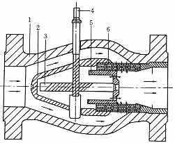 圖1?減壓閥結(jié)構(gòu)示意圖1—閥外體;?2—閥內(nèi)體;?3—活塞桿;?4—閥桿;?5—活塞;?6—籠筒?