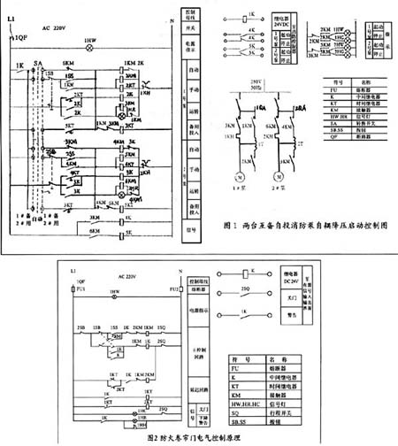 ??? 1、消防泵電氣控制:消防泵控制系統一般采取一用一備的消防控制系統。圖(1)是一用一備消防泵自耦降壓自動控制電路圖。