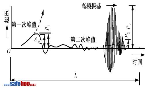 圖中A點是泄爆點,壓力從O點開始上升到A點出現(xiàn)泄爆(窗玻璃壓碎),泄瀑后壓力稍有上升隨即下降,下降過程中有時出現(xiàn)短暫的負超壓,經(jīng)過一段時間,由于波陣面后的湍流及波的反射出現(xiàn)高頻振蕩。圖2-8-1中Pv為泄爆壓力,P1為第一次壓力峰值,P2為第二次壓力峰值,Pw為高頻振蕩峰值。該試驗是在空曠房屋中進行的,如果室內(nèi)有家具或其他器物等障礙物,則振蕩會大大減弱。