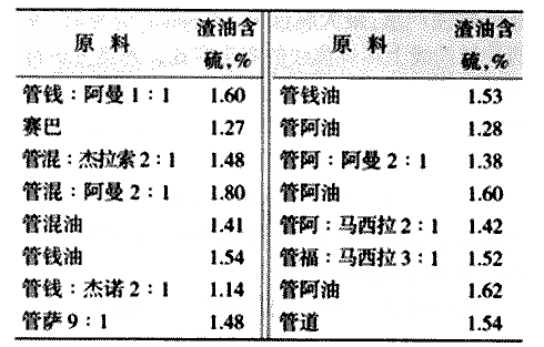 按照一般的劃分方法,含硫量低于0.5%的原油稱為低硫原油,含硫量為0.5%~2%的原油稱為含硫原油,含硫量高于2%的原油稱為高硫原油。原油在一次加工過程中,原油中硫的分布隨著石油餾分沸點的增加,硫含量也呈倍數遞增的趨勢。原油中的硫主要分布在重質餾分中,其中減壓渣油中的硫占原油硫的50%以上,從而加深了以加工減壓渣油為原料的焦化裝置的設備腐蝕。我公司主要加工管道、阿曼、馬西拉、杰拉索、賽巴的混合原油,其渣油硫含量如表1。
