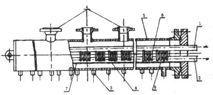 注:1——進水小集箱;2——出水小集箱;3——進汽管;4——出汽管;5——筒體;6——蛇形管;7——左(北)護板;8——右(南)護板;9——護板孔