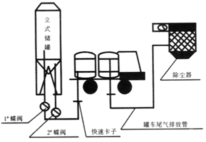 改造前散裝水泥裝卸是在裸口狀態(tài)下進行的,憑經(jīng)驗控制下灰。粉塵外溢嚴(yán)重,造成作業(yè)場所及周圍環(huán)境粉塵濃度嚴(yán)重超標(biāo)(見圖2)。根據(jù)現(xiàn)場工藝情況,設(shè)計將儲存罐中部的出灰口截掉堵死,在底部設(shè)計安裝一臺分配器,用兩只4"蝶閥控制一根軟管,軟管另一頭用快速卡連接在灰罐車上,灰罐車的頂部罐口裸口蓋嚴(yán),罐車的尾氣排放口用軟管連接在除塵器上,上灰時關(guān)掉1#蝶閥,打開2#蝶閥,下灰時相反操作(見圖3),實現(xiàn)了全封閉水泥裝卸。