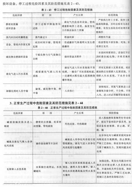 裝置停工程序:降進(jìn)料量一切斷進(jìn)料一退物料一退催化劑、堿液一設(shè)備、管線吹掃一設(shè)備水洗在停工過程中,容易產(chǎn)生危險因素主要是:降溫速度過快造成設(shè)備凍壞,硫化物自燃損壞設(shè)備。停工過程危險因素及其防范措施見表2—43。