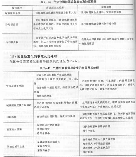 隨著石油的深加工,工藝越來越先進(jìn),程序越來越細(xì)化,但防腐蝕問題也越來越突出。對加工設(shè)備的防腐要求也越來越高,由于各種硫化物和有機(jī)酸隨加工過程逐步積累到最輕部分。在氣體分餾加工過程中也較為明顯,其下游裝置對其含硫物質(zhì)的要求也越來越苛刻。脫除硫化物一般都在物料進(jìn)入裝置前進(jìn)行處理,然后再進(jìn)行加工,但目前氣體分餾裝置仍存設(shè)備腐蝕問題,氣體分餾裝置設(shè)備腐蝕及防范見表2—45。