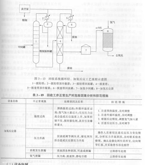 回收系統主要保護加氫催化劑,嚴防空氣進入系統,造成飛溫。嚴防氫氣泄漏,氫氣壓力高,一旦泄漏很容易被靜電引燃,釀成重大事故。正常生產時危險因素分析和防范措施見表3—89。