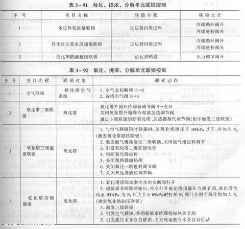 計算機集散控制外,還設置了FSC系統(failsafecontml,故障安全系統)。所有控制器及輸入、輸出卡件均采用冗余結構,具有系統自診斷功能,同時,通過SOE(sequenceofevent,事件順序記錄)對所有操作在秒級進行記錄,以保證系統運行的可靠性。有高低液位聯鎖,高低流量聯鎖,高低壓力聯鎖,更有溫度4級聯鎖,針對不同情況進行相應自動處理。相關單元的聯鎖控制見表3—91、表3—92、表3—93、表3—94。