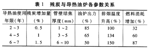 ????殘?zhí)渴嵌喹h(huán)芳香烴、腔質(zhì)和瀝青質(zhì)的混合物,導(dǎo)熱油在空氣不足的條件下受強熱作用易于分解、脫氫縮合而成殘?zhí)俊執(zhí)苛康拇笮】纱笾屡卸▽?dǎo)熱油在高溫使用中的結(jié)焦傾向。殘?zhí)康膫鳠嵯禂?shù)與金屬相差很大,結(jié)焦越嚴(yán)重能耗越大,所以殘?zhí)渴怯绊憣?dǎo)熱油爐正常使用的主要因素。殘?zhí)颗c導(dǎo)熱油爐各參數(shù)關(guān)系見表1。