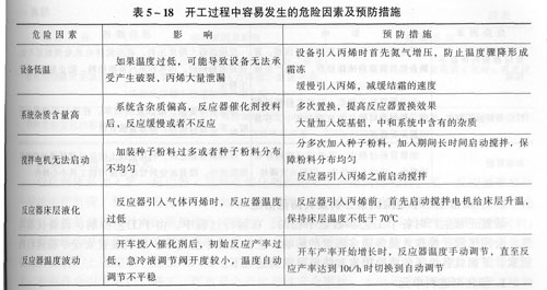 在開車過程中,裝置從常溫、常壓逐漸升高至操作值,公用工程、原料、催化劑逐步引入裝置,各個環節緊緊相扣,裝置的操作參數變化塊,物料引入引出頻繁,比較容易發生事故,開工過程中容易發生的危險因素及預防措施如表5—18所示。