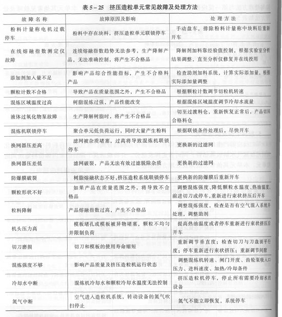 擠壓造粒系統(tǒng)把脫活、脫揮發(fā)分處理的粉料加入助劑進(jìn)行穩(wěn)定,然后熔融、過濾和造粒。聚丙烯粉料和助劑在混煉機(jī)中充分混煉、熔融和均化,熔融聚丙烯經(jīng)齒輪泵增壓,熔融聚丙烯經(jīng)過切粒機(jī)模板束狀擠壓后進(jìn)人切粒室,經(jīng)過干燥的顆粒送到振動(dòng)篩進(jìn)行篩分,大顆粒和小顆粒均被篩掉,合格的顆粒送到顆粒料斗送到摻合料倉。本單元單臺(tái)設(shè)備和輔助系統(tǒng)多,因此容易發(fā)生故障。本單元其他常見故障及處理方法如表5—25所示。