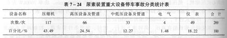 設備重大停車事故269次,按設備類別分類統計,見表7—24。其中,二氧化碳壓縮機發生停車事故117次,位居第一,占設備重大停車事故總數的43.49%。