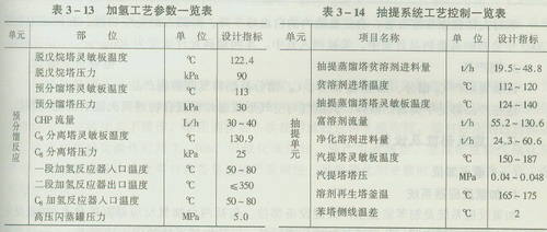 加氫及抽提制苯的裝置工藝比較多,不同工藝操作條件不同。表3—13、表3—14為燕山石化制苯裝置的主要工藝參數(shù)。
