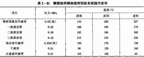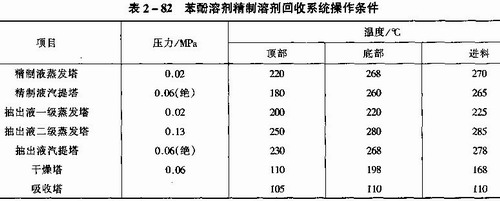 由于萃取溶劑的性質不同,它們所需要的工藝操作條件也不太一樣,而且對于不同的原料油,抽提塔的操作條件差異更大,而溶劑回收系統的操作條件受原料的影響比較小,因此,下面僅將三種溶劑精制裝置的溶劑回收系統的操作條件分別如表2—81、表2—82、表2—83所示。