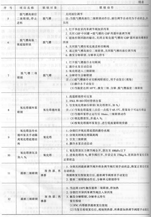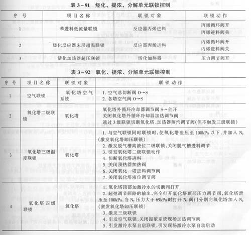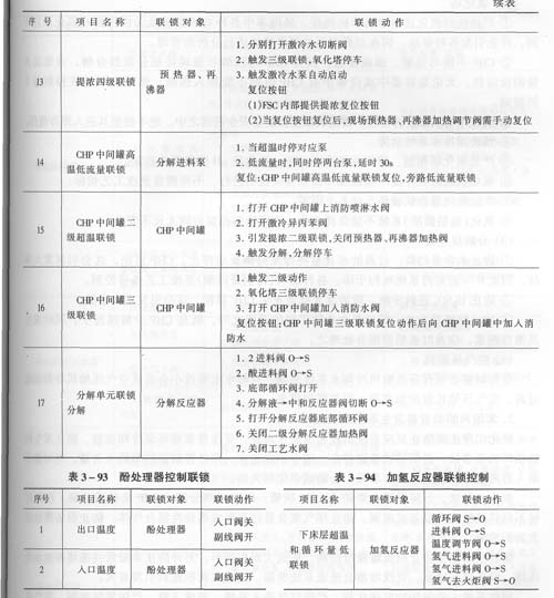 計算機集散控制外,還設置了FSC系統(failsafecontml,故障安全系統)。所有控制器及輸入、輸出卡件均采用冗余結構,具有系統自診斷功能,同時,通過SOE(sequenceofevent,事件順序記錄)對所有操作在秒級進行記錄,以保證系統運行的可靠性。有高低液位聯鎖,高低流量聯鎖,高低壓力聯鎖,更有溫度4級聯鎖,針對不同情況進行相應自動處理。相關單元的聯鎖控制見表3—91、表3—92、表3—93、表3—94。