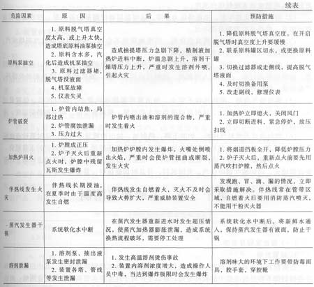 三、危險因素及其防范措施溶劑精制裝置的原料及產品均為減壓餾分油,密度較大,操作過程為物理分離過程,溫度、壓力較低,所以危險性比較小。本裝置在火災危險性分類中為乙類。