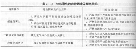 裝置的特殊操作是指加氫反應(yīng)系統(tǒng)的催化劑再生、催化劑預(yù)硫化和一段催化劑活化操作。由于操作改變了工藝操作條件和工藝流程,以及產(chǎn)生劇毒的硫化氫氣體,所以存在著很大的危險因素。危險因素及預(yù)防措施列于表3—16。