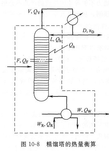 精餾裝置的能耗主要由塔底再沸器中的加熱劑和塔頂冷凝器中冷卻介質(zhì)的消耗量所決定,兩者用量可以通過對(duì)精餾塔進(jìn)行熱量衡算得出。