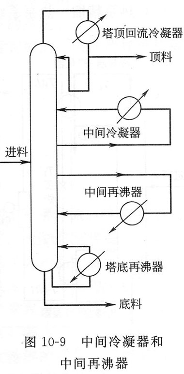(1)中間冷凝器和中間再沸器? 普通精餾塔只在塔頂和塔底對塔內(nèi)物料進行冷凝和蒸發(fā),在一座精餾塔內(nèi)溫度自塔頂向塔底是逐漸升高的。對于頂溫低于環(huán)境溫度、底溫高于環(huán)境溫度,而且頂、底溫差較大的精餾塔,如能在精餾段設(shè)置中間冷凝器就可用此塔頂冷凝器溫度稍高而價格較高的低溫制冷劑來提供冷量,從而節(jié)省有效能,如圖10—9所示。同理,如果在提餾段設(shè)置中間再沸器,就可用溫度比塔底再沸器稍低而價格較廉的熱劑為熱源,達到節(jié)能的目的。在深冷分離塔中,則可以回收溫位較低的冷量。