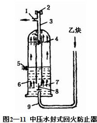 (a)阻火裝置。其作用是發(fā)生回火時(shí)防止火焰進(jìn)入貯氣罐、主罐或進(jìn)入乙炔管道內(nèi)。例如水封式或干式回火防止器。